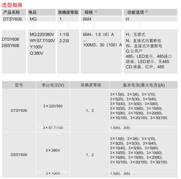 如客戶需要互感式的DTSY606三相四線電子式預(yù)付費(fèi)電能表,電壓為220/380V,準(zhǔn)確度等級(jí)為1,電流規(guī)格為1.5(6)A,LED顯示、帶485接口則相對應(yīng)的訂貨編碼為:DTSY606MQ16M4H485