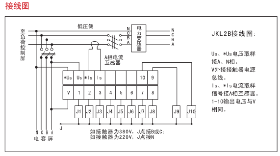 如客戶需要JKL2B型智能無(wú)功功率自動(dòng)補(bǔ)償控制器,工作電壓為220V,規(guī)格為4回路,輸出電壓為常規(guī),則相對(duì)應(yīng)的訂貨編碼為:JKL2BM10