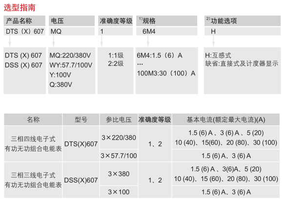 如客戶需要三相四線電子式有功無功組合電能表,電壓為220V,準(zhǔn)確度等級(jí)為1,電流為1.5(6)A,功能選項(xiàng)為互感式,則相對(duì)應(yīng)的訂貨編碼為:DTS(X)6074MQ16M4H