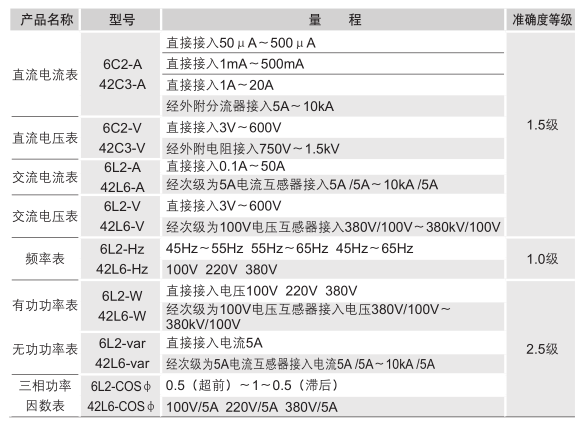 量程參數(shù)表(詳細(xì)信息請參閱固定式直接作用模擬指示電測量儀表附表匯總)