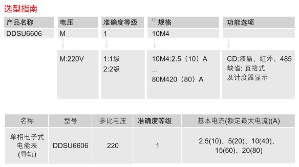 訂貨示例: 如客戶需要DDSU6606型單相電子式電能表(導軌、液晶、紅外、485),電壓為220V,準確度等 級為1,電流規(guī)格為10(40)A,則相對應的訂貨編碼為DDSU6606M140M4CD